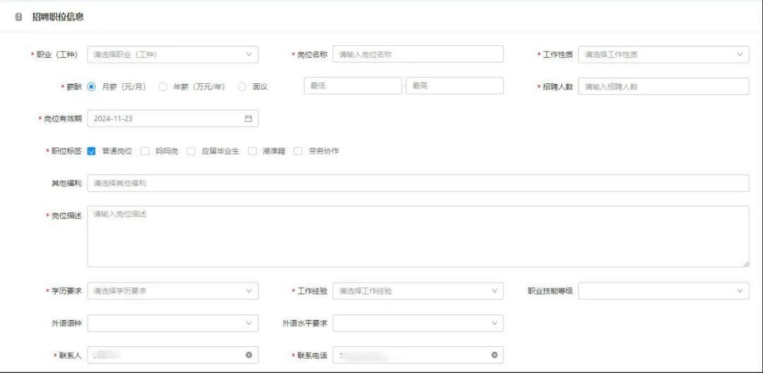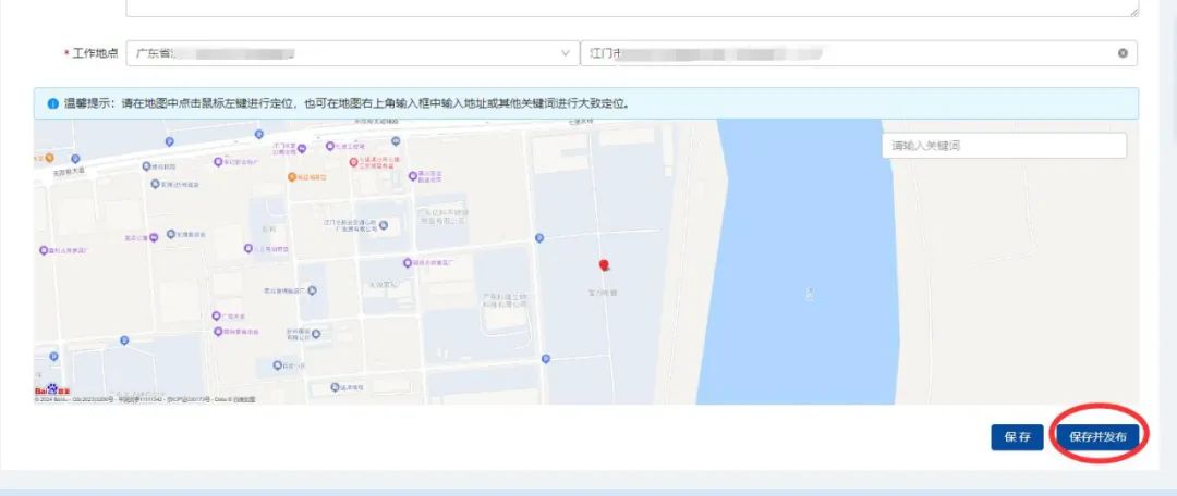 完善招聘職位信息,帶*號(hào)的為必填項(xiàng)??牲c(diǎn)擊【保存】按鈕保存職位信息,也可點(diǎn)擊【保存并發(fā)布】將該職位信息提交到人社部門進(jìn)行審核。