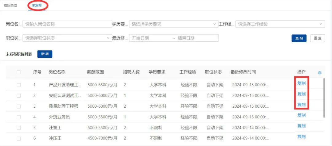 4、復(fù)制職位:點(diǎn)擊崗位列表的【復(fù)制】按鈕,復(fù)制當(dāng)前職位。復(fù)制成功后的職位,在【未發(fā)布】列表顯示,可對(duì)該職位進(jìn)行修改、發(fā)布等操作。