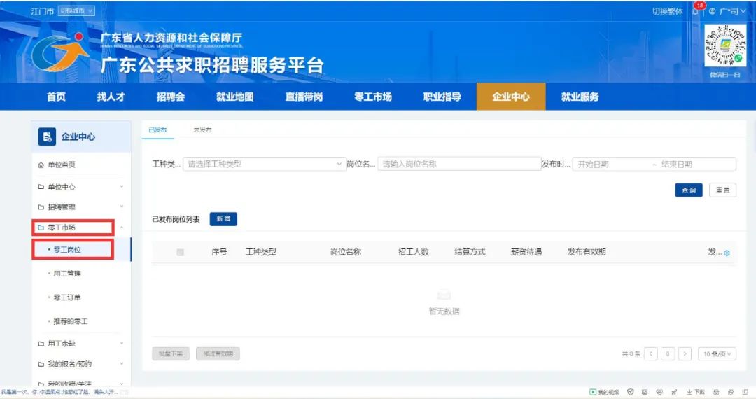 廣東公共求職招聘服務(wù)平臺(tái)→企業(yè)中心→零工市場→零工崗位