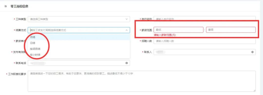【注意:零工崗位的“結(jié)算方式”分別有月結(jié)、日結(jié)、按項(xiàng)目結(jié)、按小時(shí)結(jié)四種,填寫“薪酬范圍”時(shí)請(qǐng)務(wù)必注意與結(jié)算方式相匹配】