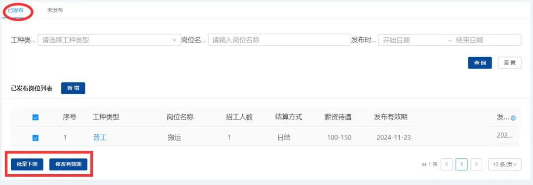 2、下架職位:只能對(duì)已發(fā)布的職位進(jìn)行該操作。在【已發(fā)布】列表頁,勾選單條或多條職位,點(diǎn)擊【批量下架】按鈕,即可下架職位。下架的職位,求職者在公共就業(yè)平臺(tái)無法搜索到該職位。