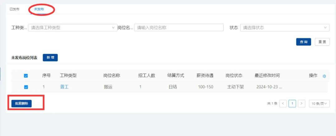 4、刪除職位:只能對(duì)未發(fā)布的職位進(jìn)行該操作。在【未發(fā)布】列表頁,勾選單條或多條職位,點(diǎn)擊【批量刪除】按鈕,即可刪除職位。