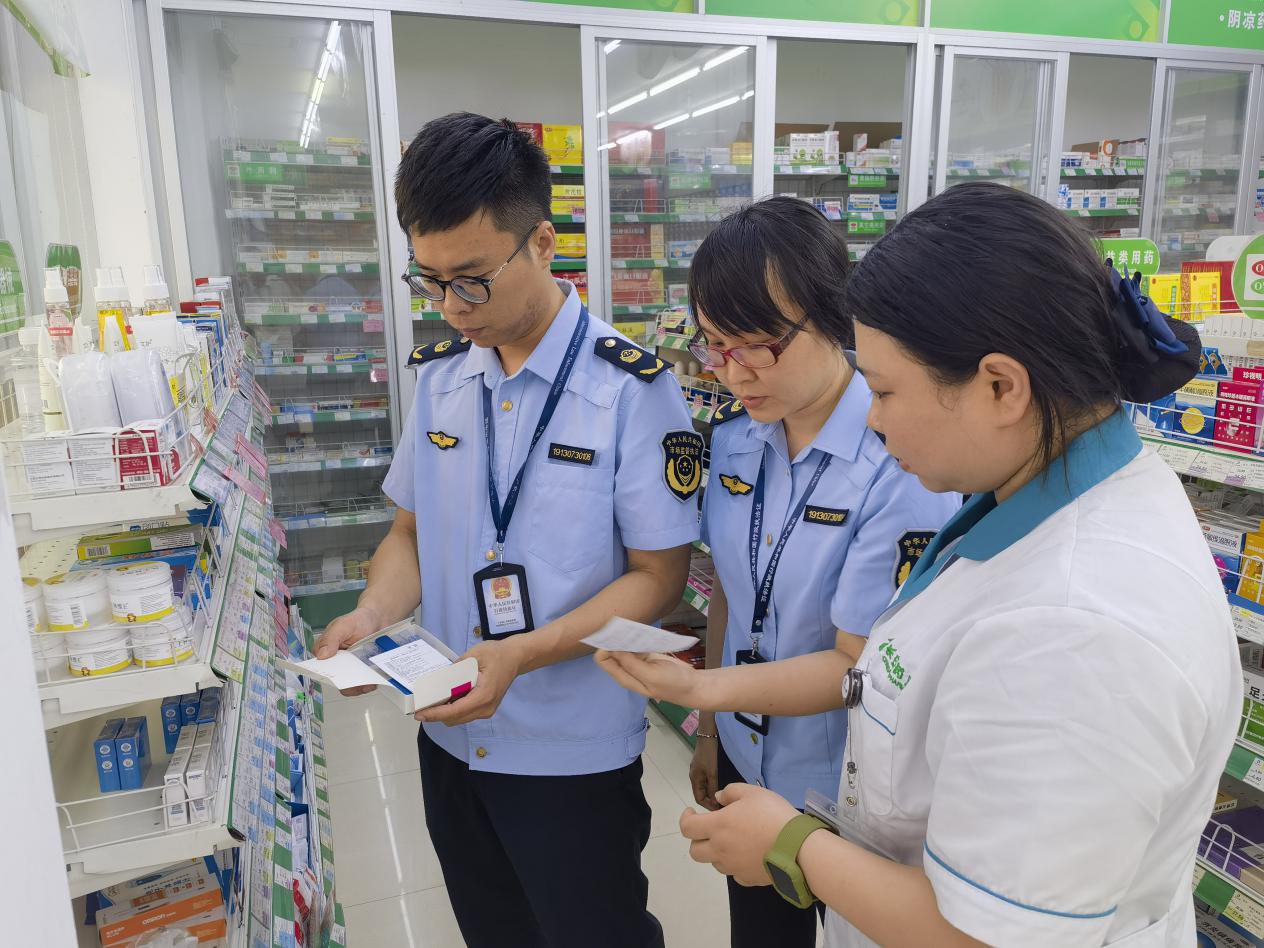 執(zhí)法人員在零售藥店對(duì)退熱類藥品、醫(yī)療器械進(jìn)行檢查