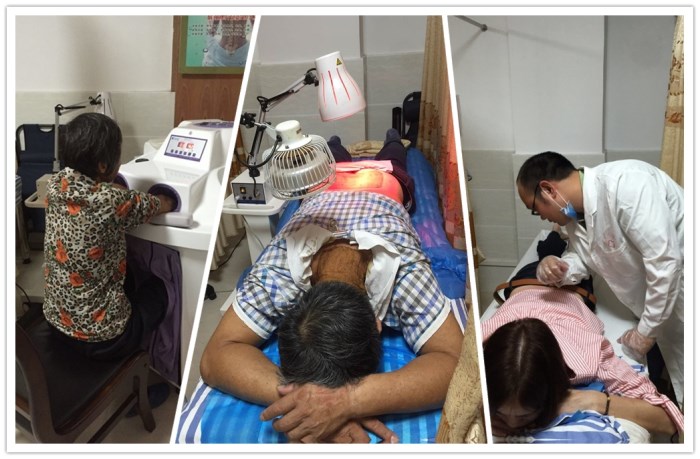 東成鎮(zhèn)衛(wèi)生院開展中藥熏蒸治療(左)、中藥貼敷治療(中)、中醫(yī)推拿治療