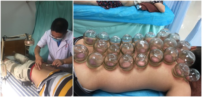 君堂鎮(zhèn)江洲衛(wèi)生院開展針灸治療(左),平石社區(qū)衛(wèi)生服務中心開展拔罐治療